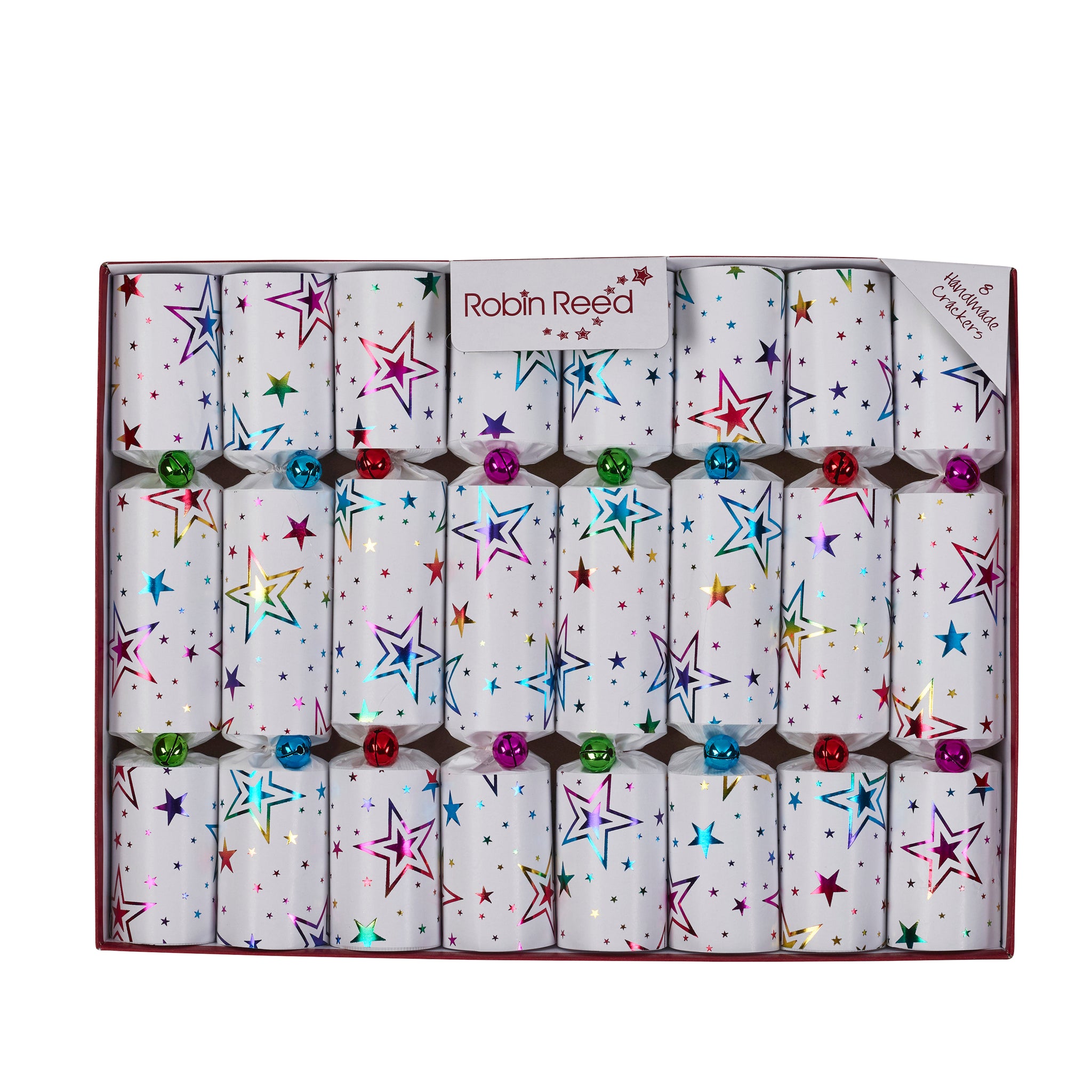 8 x 10″ Handmade crackers with a sparkling star design.  Each cracker contains a snap, party hat, amusing joke, trivia and a magic trick